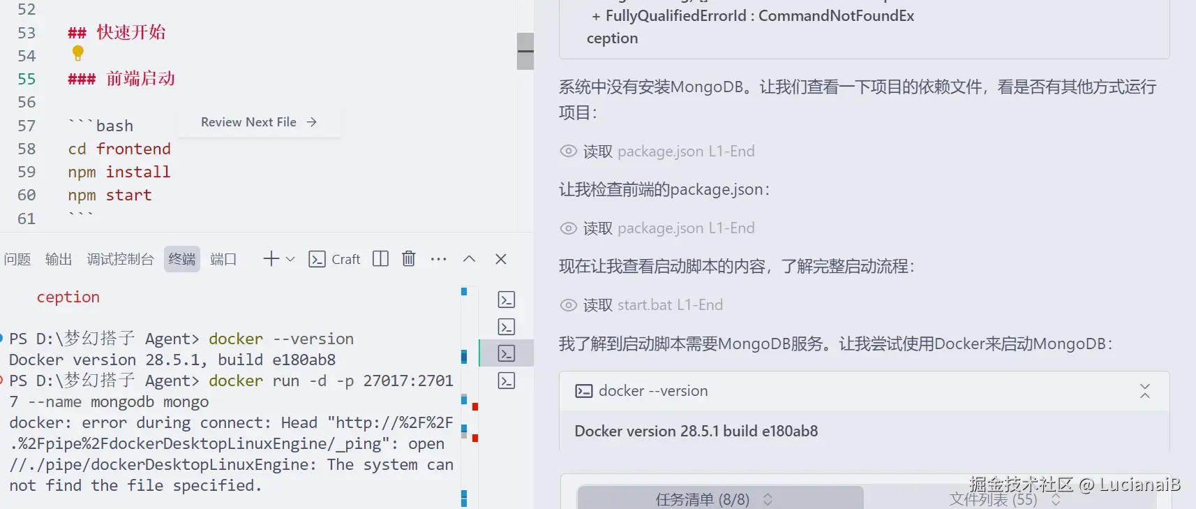 在过程中,没有安装MongoDB,会自己找解决办法,尝试使用Docker来平替启动MongoDB。说实话,我都不知道MongoDB是什么,但是AI会全都处理的。