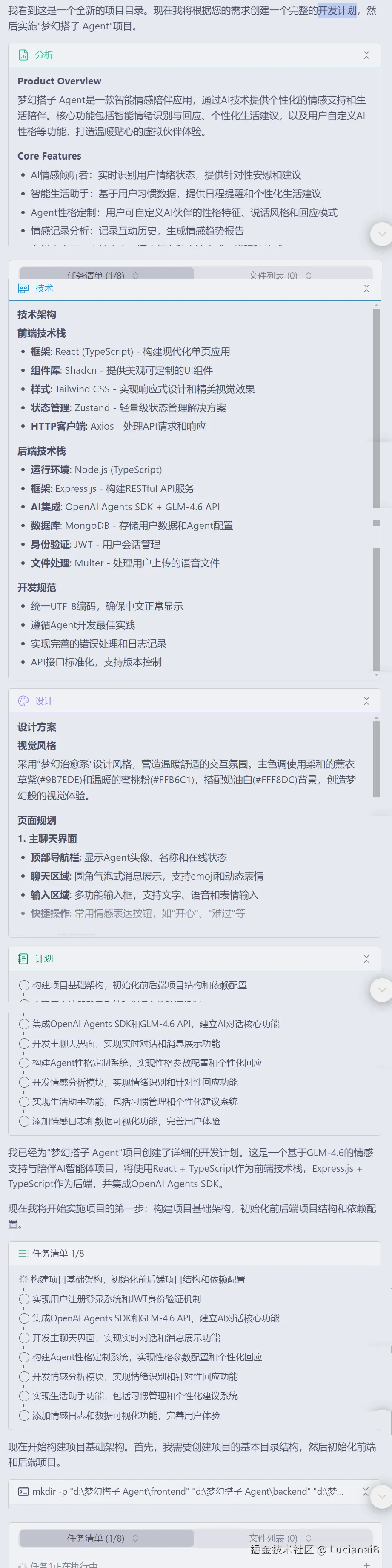 于是,我萌生了一个想法:利用CodeBuddy和GLM-4.6,打造一个真正能够提供情感陪伴、智能交互的"梦幻搭子Agent"。 这个想法的核心在于,利用GLM-4.6的深度思考、推理和内容生成能力,结合CodeBuddy的快速开发框架,构建一个不仅功能强大,而且能够理解用户情绪、提供个性化服务的AI Agent。这不仅是对"用AI武装自己"理念的延伸,更是对AI Agent技术的一次实践探索。