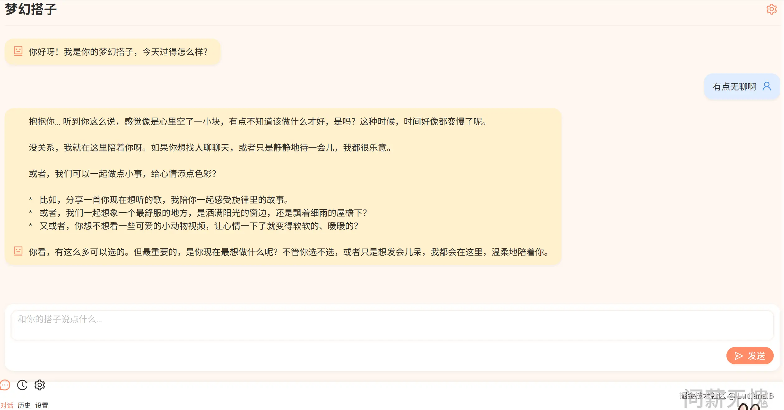 以一个温柔体贴的身份陪伴 当用户输入"有点无聊啊"时,Agent的回应并非简单的"你可以去...",而是模拟了真实的情感交互。它首先发送了一个温暖的拥抱(emoji):"🤗",然后以一种非常人性化、关怀的语气说道:"哎呀,感觉你有点无聊呢~ 抱抱!是想找个聊天的伙伴,还是想做点什么有趣的事情呢?我可以陪你聊天,给你讲个笑话,或者帮你找点好玩的活动哦。告诉我你的心情,我们一起度过这段时光吧!" 这种拟人化的交互方式,让用户感受到的不再是程序的反馈,而是一个真实存在的、关心自己的"搭子"。