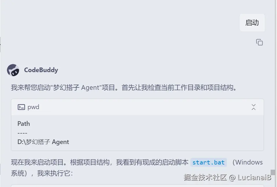 有时候进行一半,不知道如何启动,不用慌,我们是AI的主人,直接霸气对他说:启动。 AI就帮助我们快速的启动项目了。