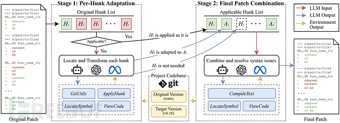 其工作流程分为两个阶段:首先适配补丁的每个代码块(称为"hunk"),检查变更有效性并收集支持代码片段;然后整合所有适配后的代码块,执行编译测试。若出现错误,系统会分析问题并调整补丁。这种基于上下文和反馈的机制,使其能理解代码关系并推断版本库历史中的缺失细节。