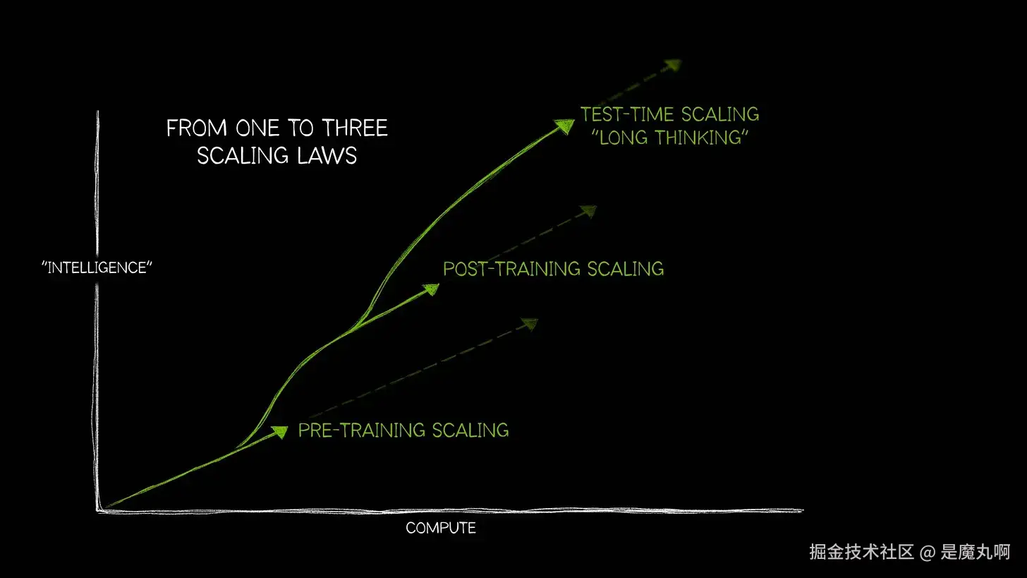 The price per token for the frontier model stayed constant是因为模型规模的增加和更多的测试时扩展。测试时扩展,也称为长时间思考,是扩展AI的第三种方法,如下图所示。