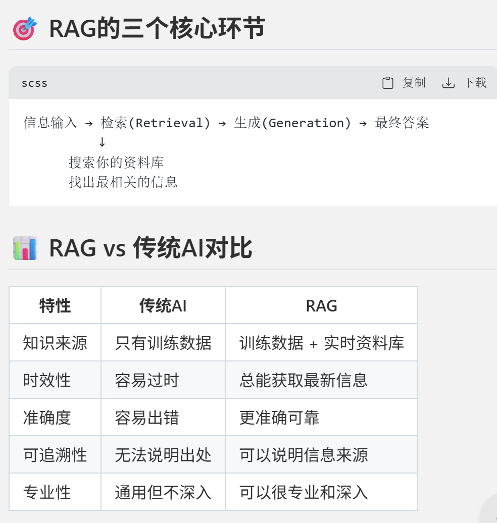 最后总结RAG的核心主要在于检索和生成,也拉表格和传统AI做了全面对比,最后的一句话总结