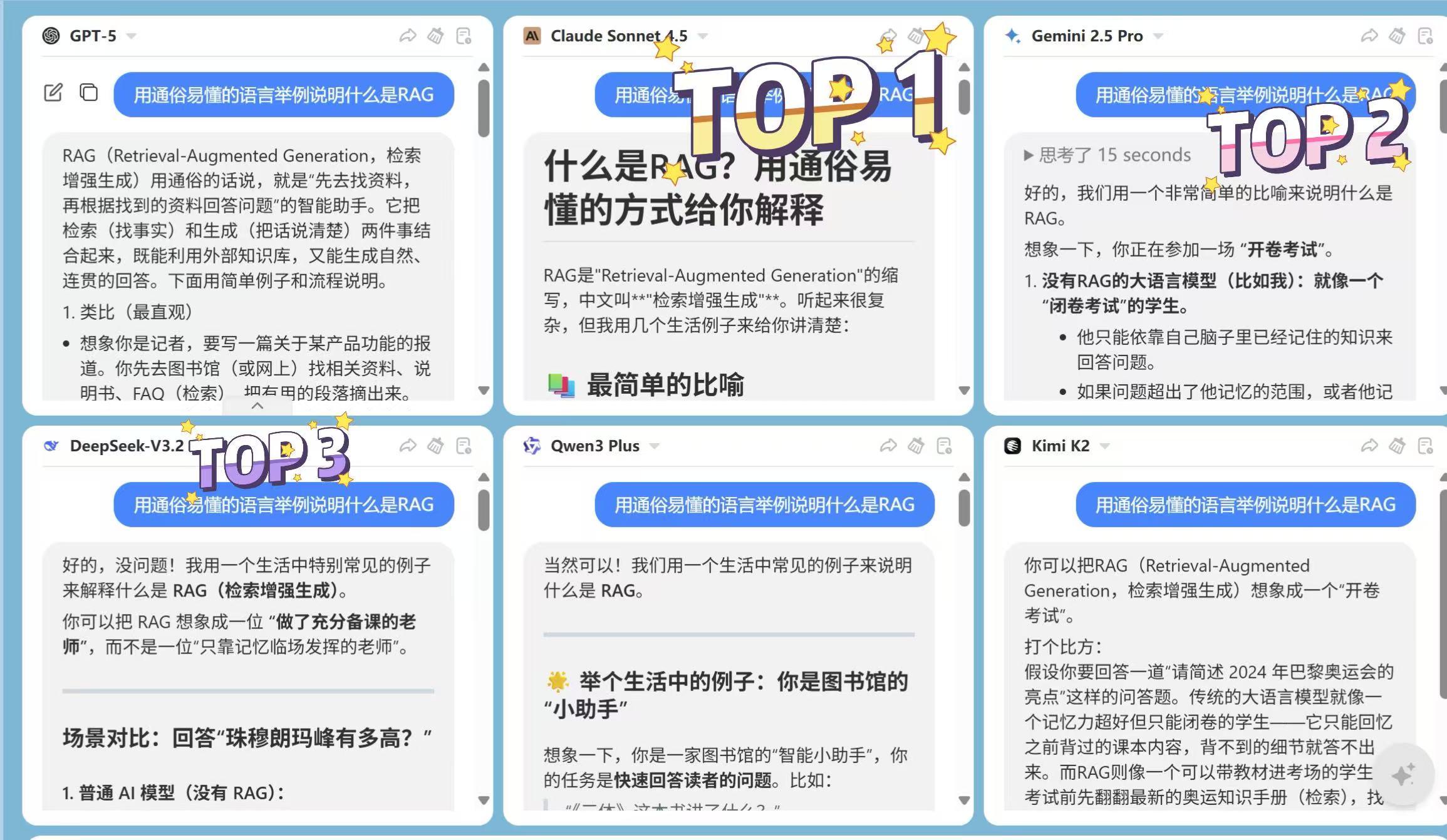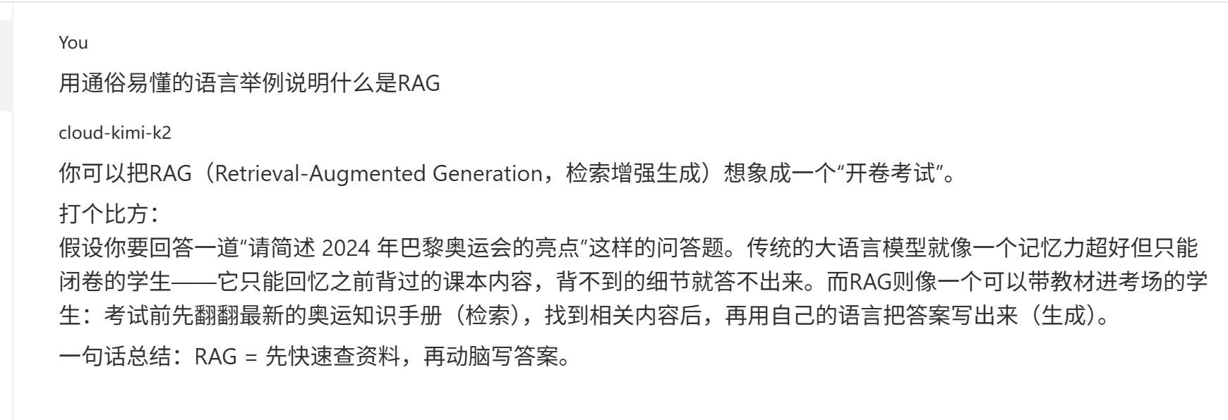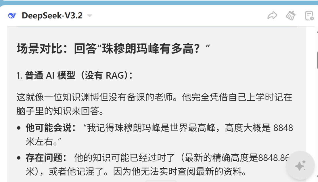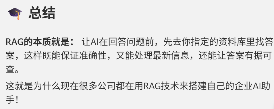 然后就开始对比RAG比普通AI好在哪里,完全没有抽象出来RAG标准化的核心内容,然后一句总结就结束了。在Claude的回答对比之下,显得简陋了不少。