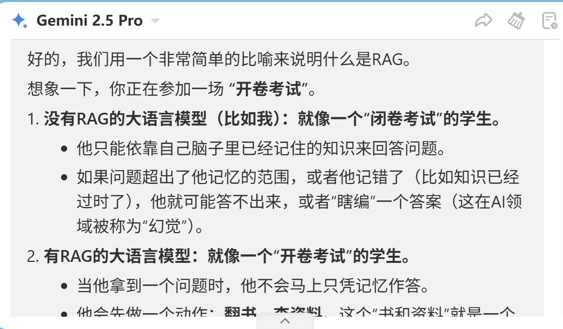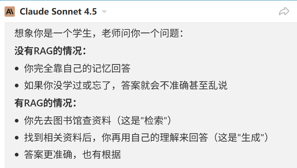 首先,Claude的回答非常全面,先是用一个学生的例子简述有RAG和无RAG就像一个 学生有没有参考资料的区别。