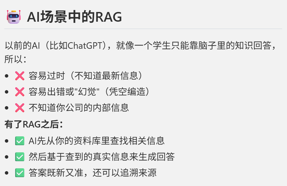 然后,迁移到AI场景里,用更专业的词汇来讲清楚这种区别在于:用了RAG,回答更靠谱