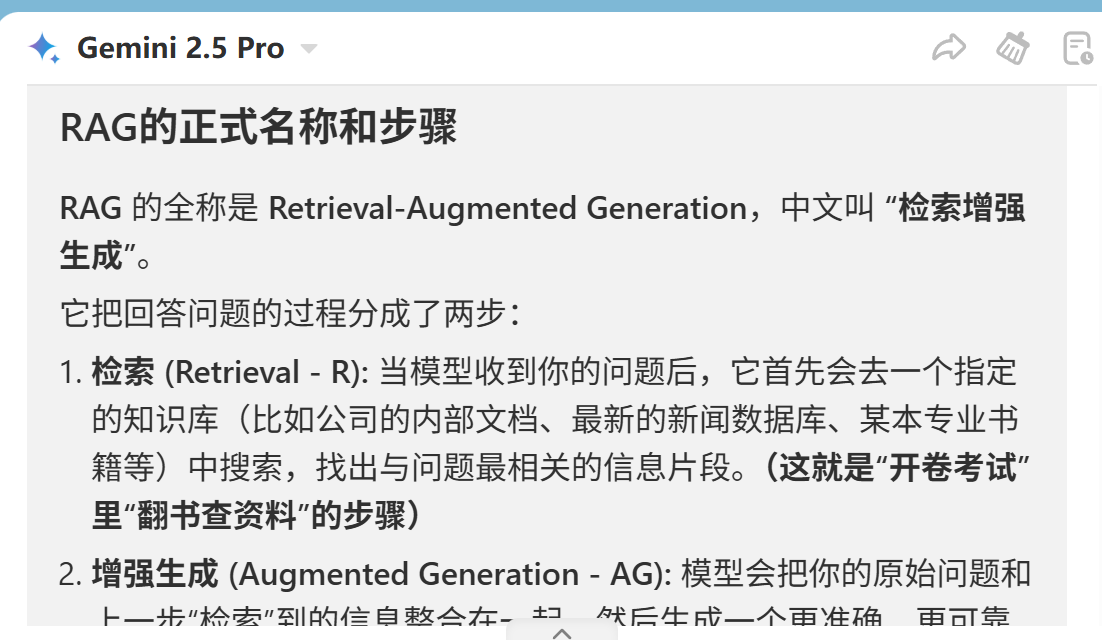 如果想了解清楚RAG,还需要再追问一些问题,比如RAG主要分哪几个步骤,实现的流程是怎么样的,举一些实际实用的例子等等。