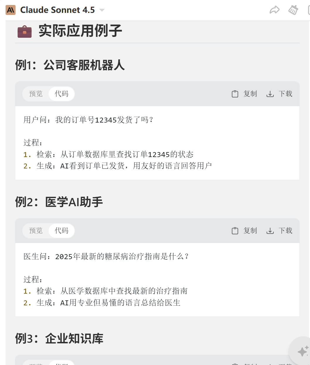 基本概念有了,接着举了3个例子说明RAG的执行过程: