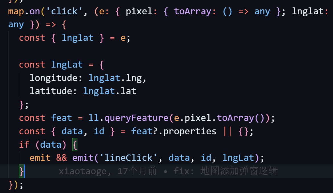 检查指定像素坐标 (ev.pixel) 位置是否存在任何地图要素