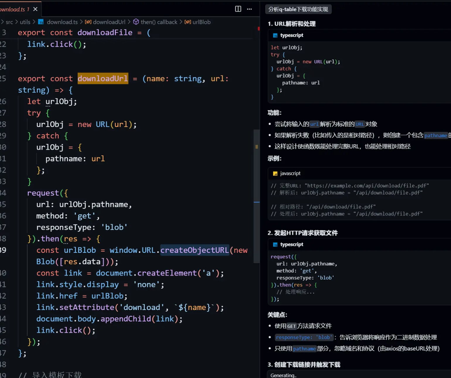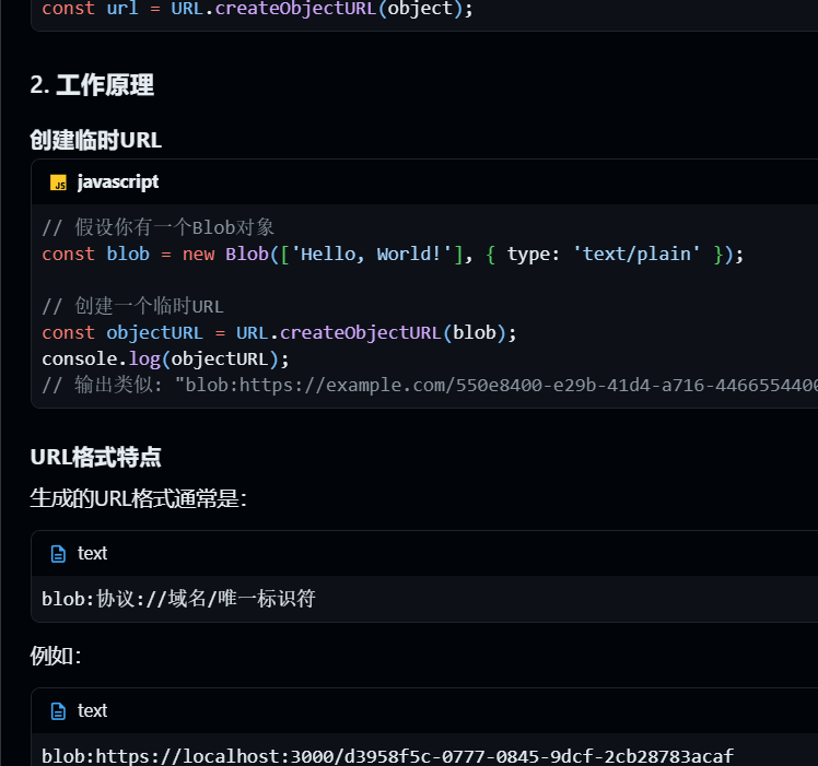 URL.createObjectURL()用于创建临时的下载链接,用于创建一个指向给定对象的URL字符串。这个URL可以用来引用 File、Blob(二进制数据) 或 MediaSource 对象的内容。