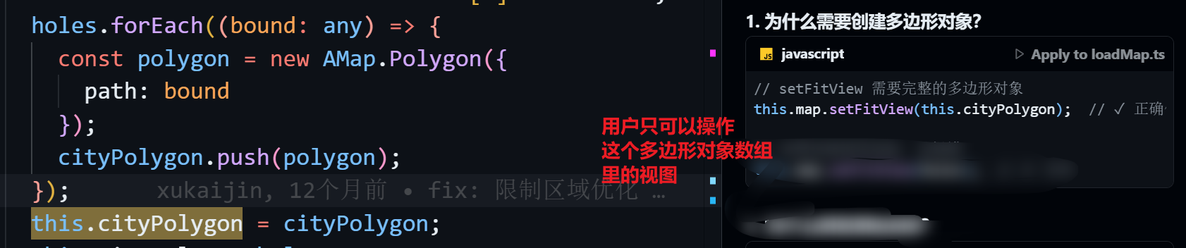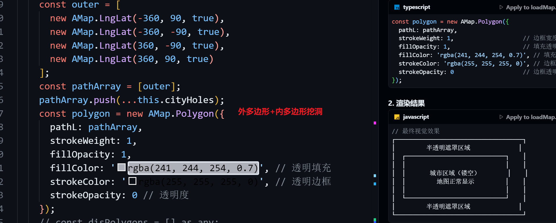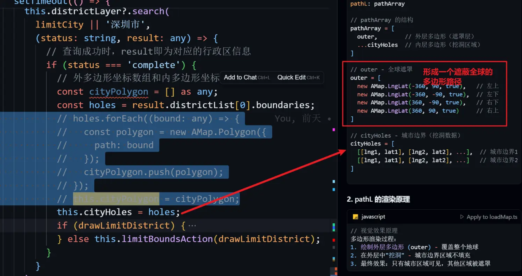挖孔后,定义可操作的地图块(其实就是城市),生成城市多边形,并用地图api setFitView调整视野。