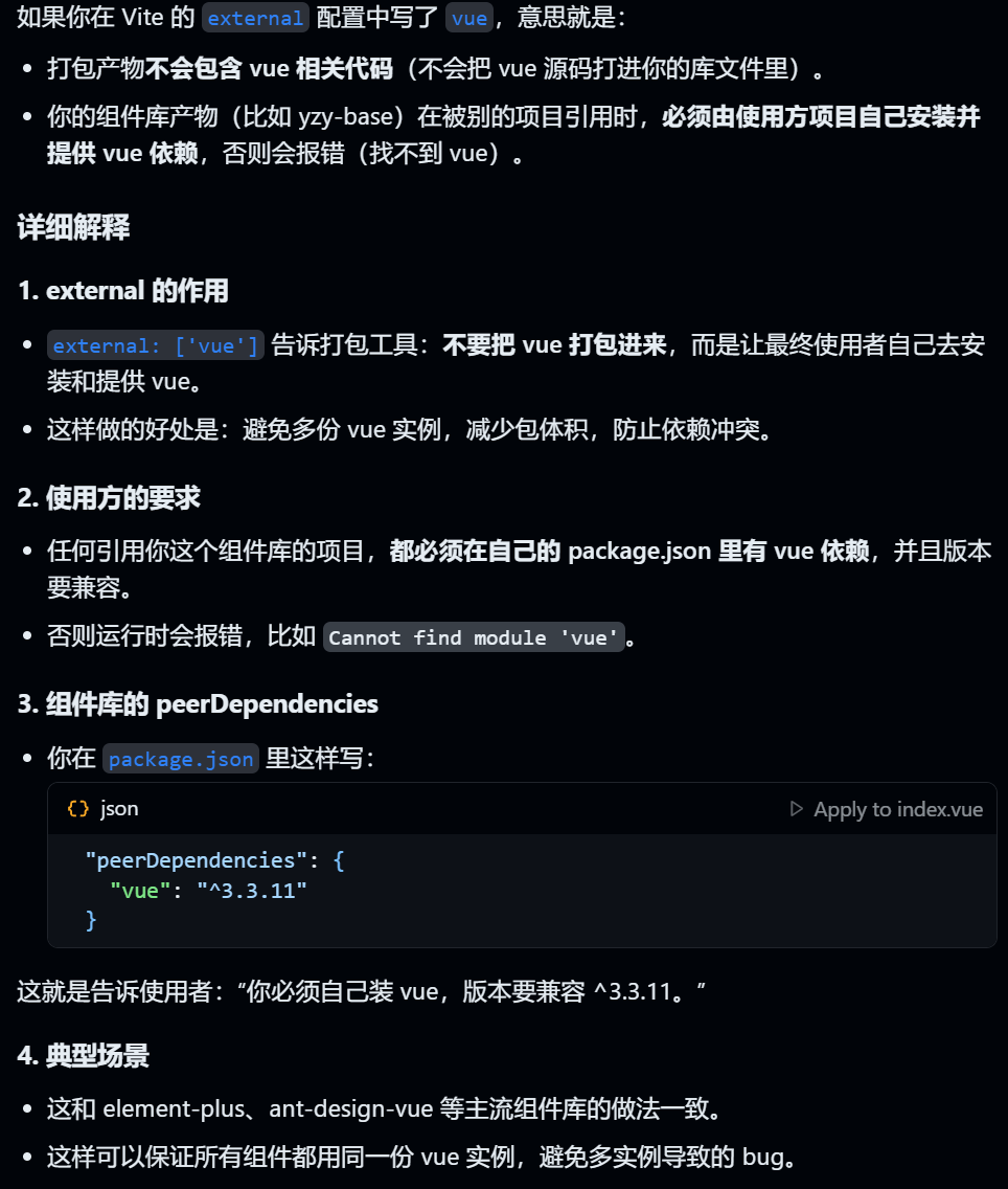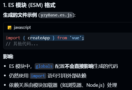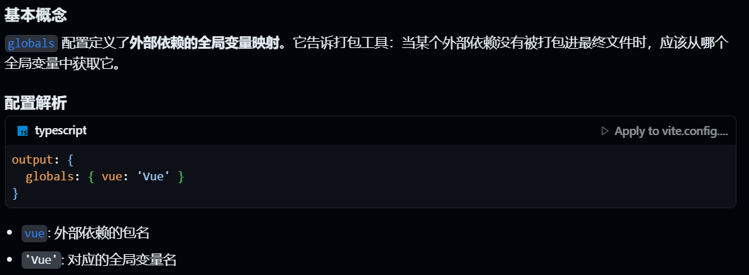 UMD模块需要全局Vue变量,受globals配置影响。所以globals属性只是为了让库能够适应现代ES模块环境,也能兼容传统的全局变量环境。