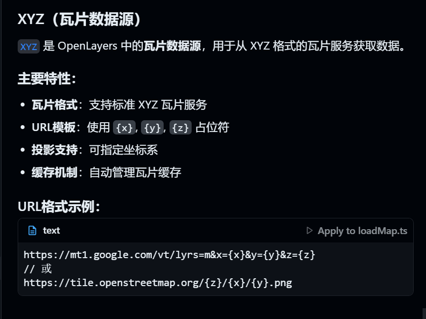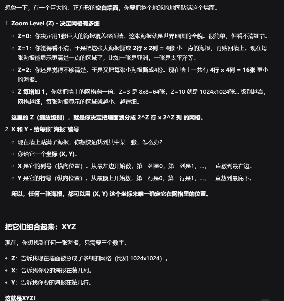 Z: 缩放级别(Zoom Level),通常从0(全球视野的一个瓦片)开始,数字越大,缩放级别越高,地图越详细。