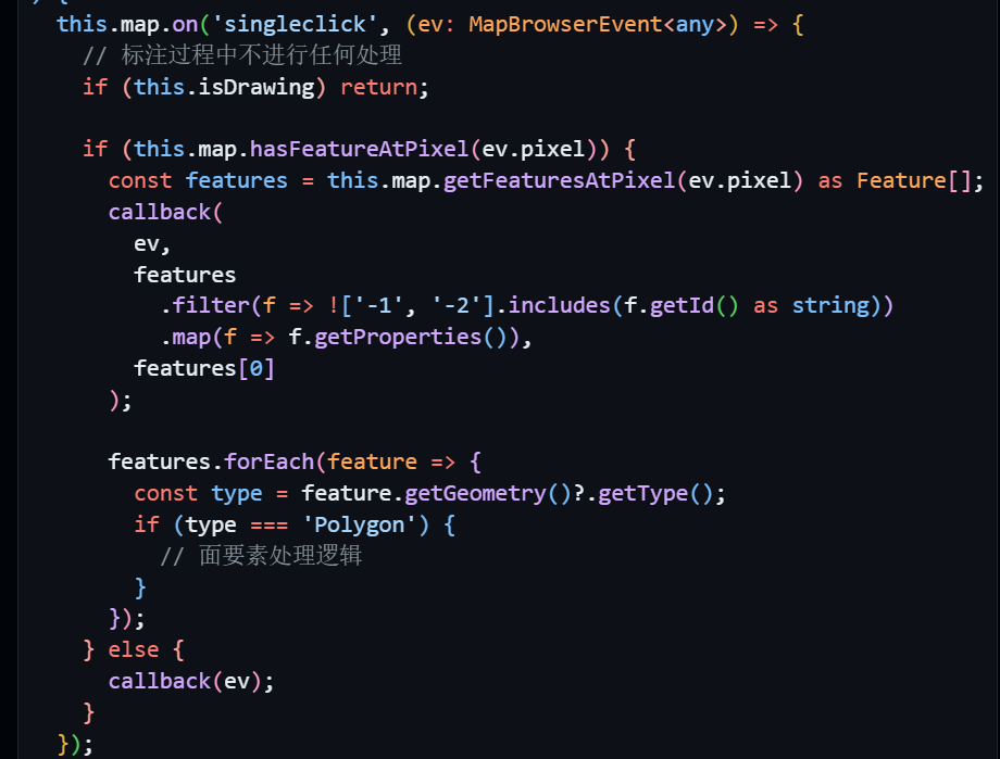 hasFeatureAtPixel(ev.pixel): 这是核心的判断方法