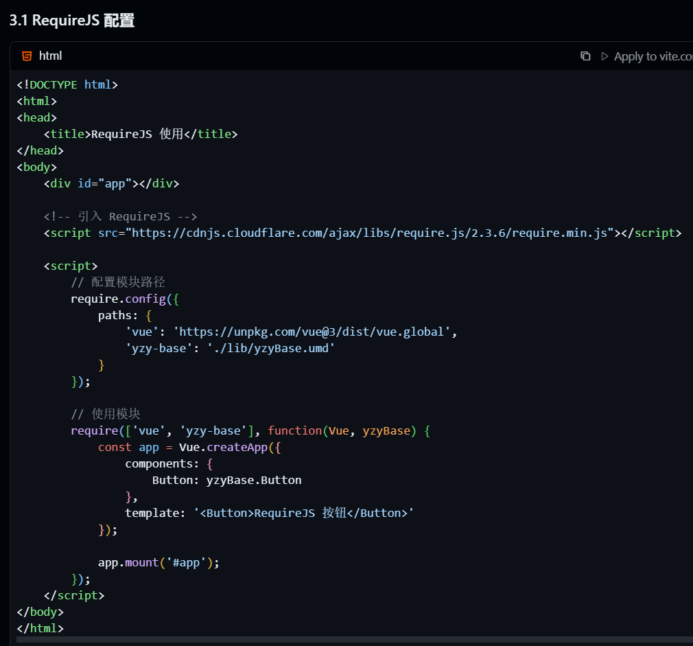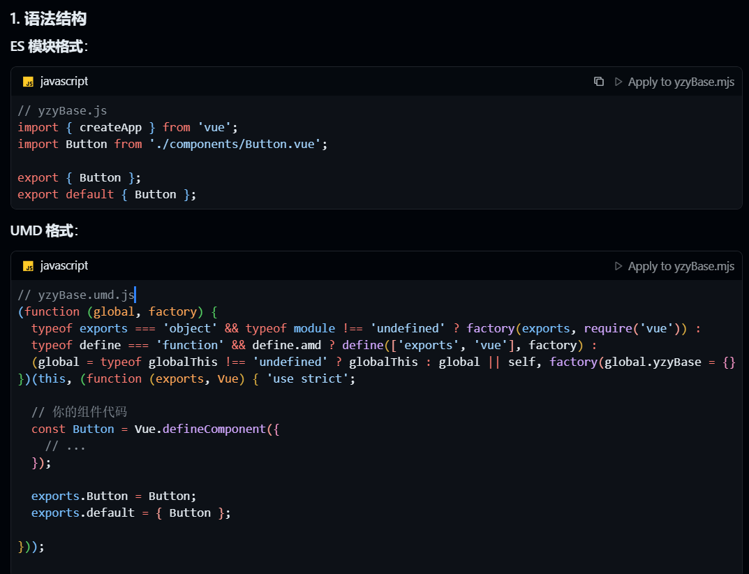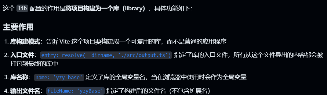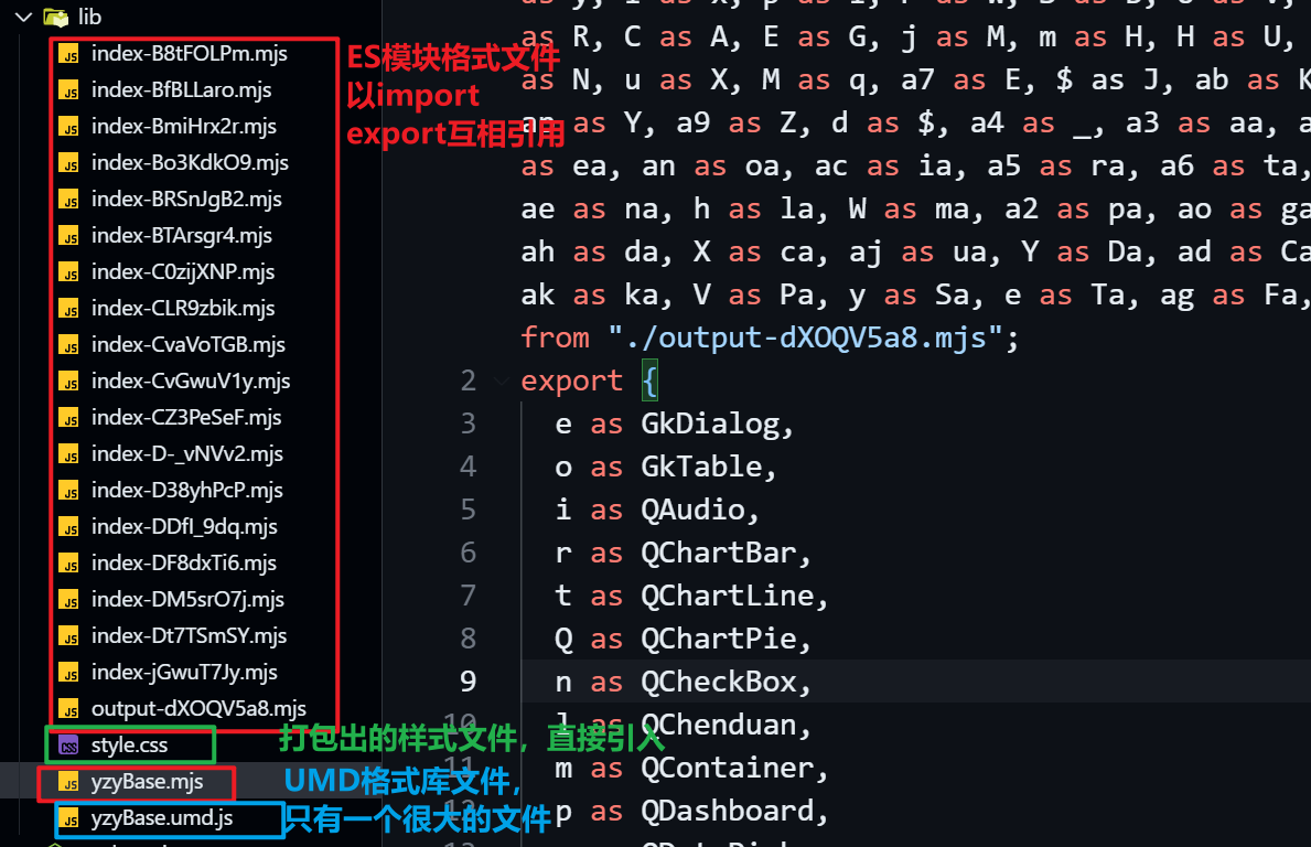 一旦配置了lib属性(如果是应用程序则无配置此属性),vite框架就会打包出两种格式的库文件(ES模块格式文件和UMD格式模块文件)。