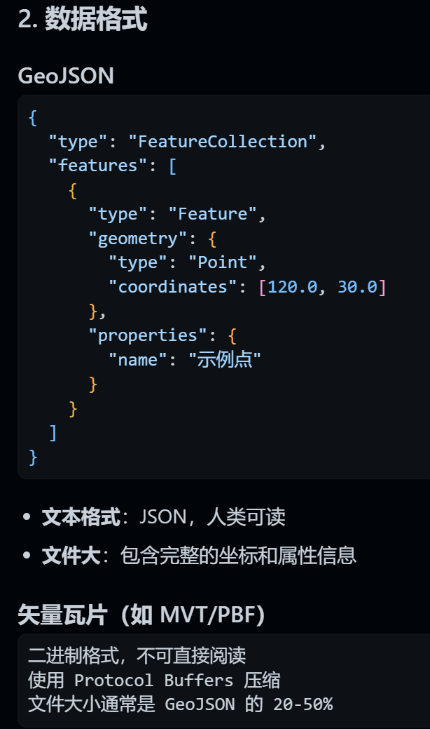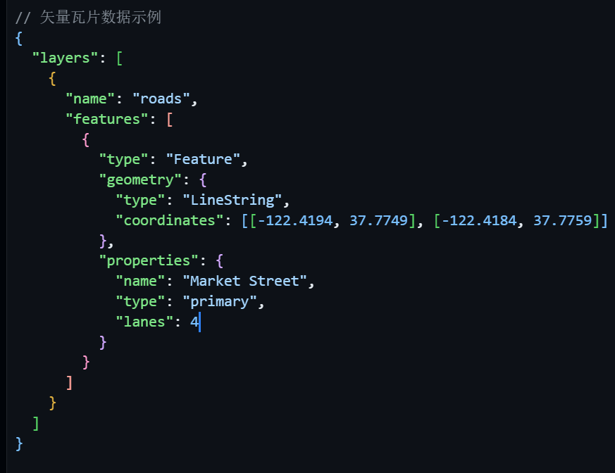 矢量瓦片是一种将地理空间数据编码为矢量格式并组织成瓦片金字塔结构的地图数据格式。与传统栅格瓦片不同,矢量瓦片存储的是几何图形(如点、线、多边形)和属性信息,而不是预渲染的位图。以下是示例,但是实际上并不是json数据结构,传输用的是二进制数据,转换后是pbf文件(类似小面结构)