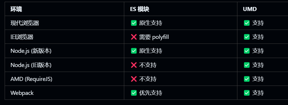 UMD格式模块可以保证库的最大兼容性,与ES格式模块对比: