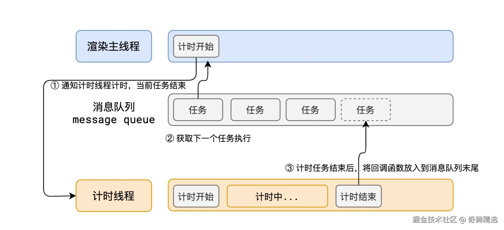 原因在于:setTimeout 的回调被放入任务队列中,需要等待当前脚本(视为一个 task)执行完毕后,事件循环才会取出并执行定时器回调。