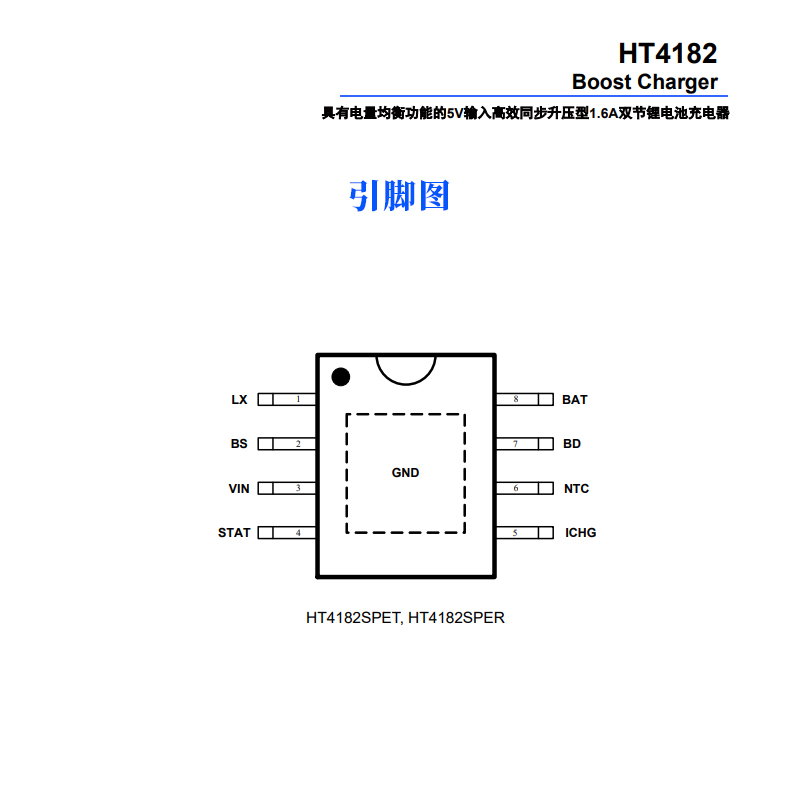随着音箱、POS机、对讲机等便携式电子设备对续航能力的要求不断提升,双节串联锂电池凭借其更高的输出电压和容量优势,逐渐成为这类设备的主流供电选择。而与之匹配的充电管理IC,不仅需要解决5V通用电源与双节锂电池的电压适配问题,更要兼顾效率、灵活性与安全性------HT4182正是为满足这些核心需求而生的5V输入升压模式充电管理IC,为双节串联锂电池的充电场景提供了全方位解决方案。