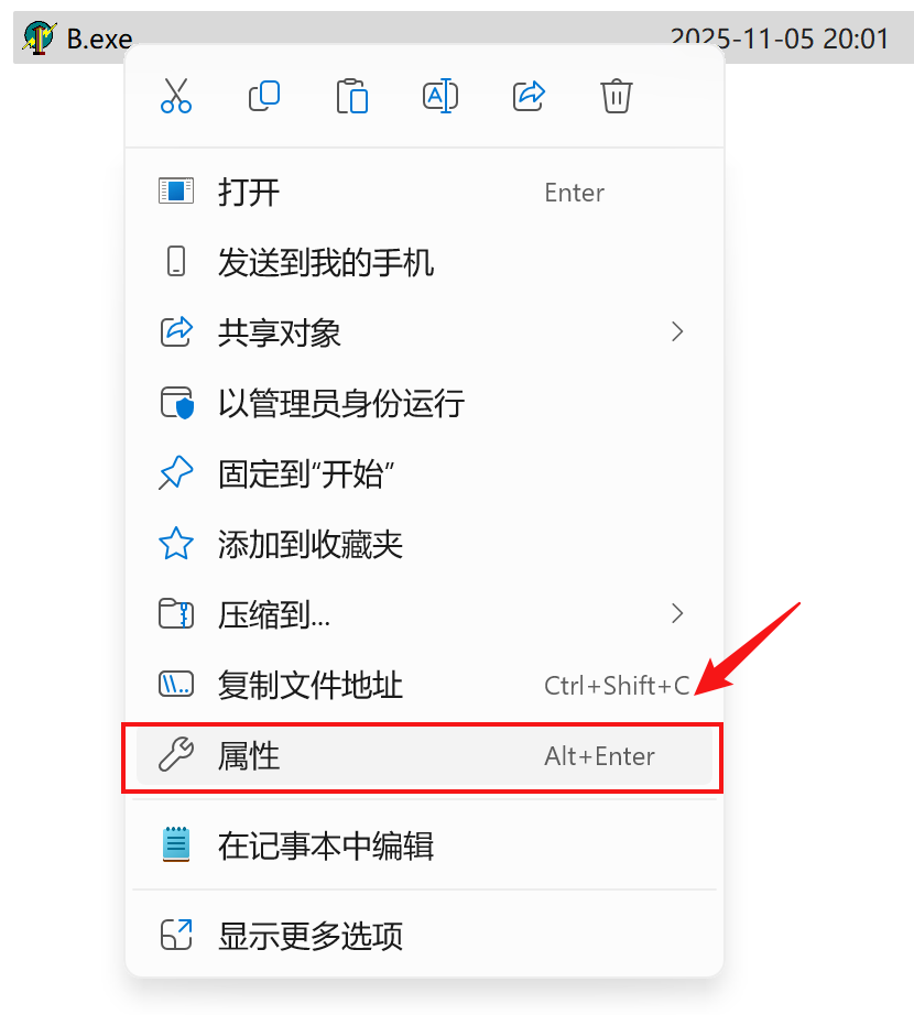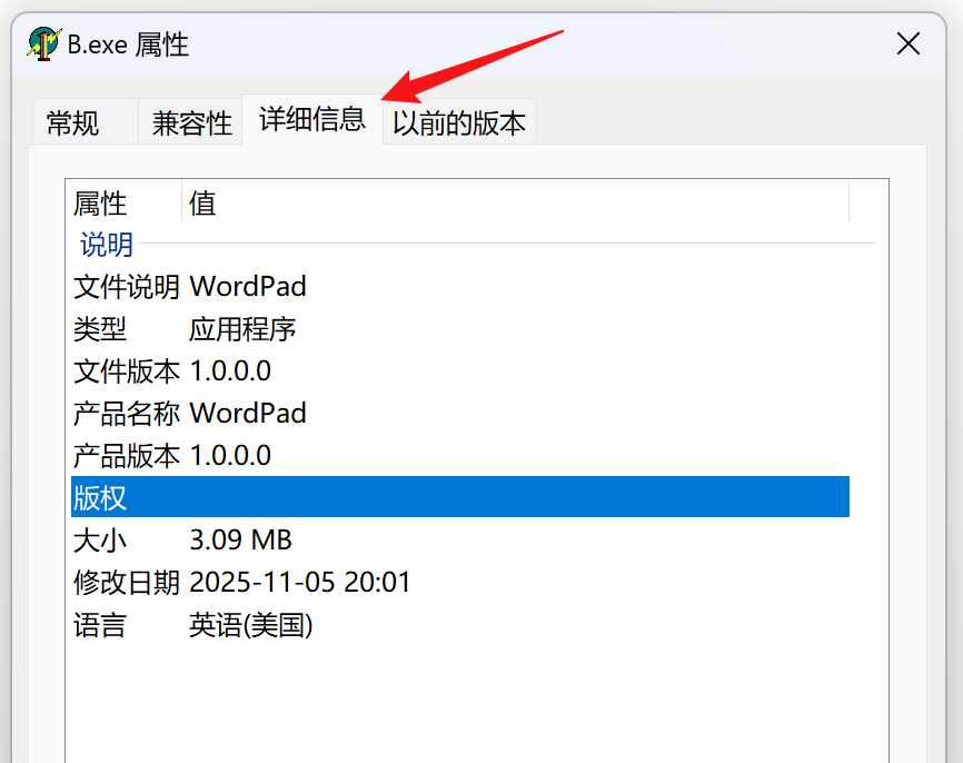 在exe文件的图标上鼠标右键菜单选择【属性】,然后选择【详细信息】