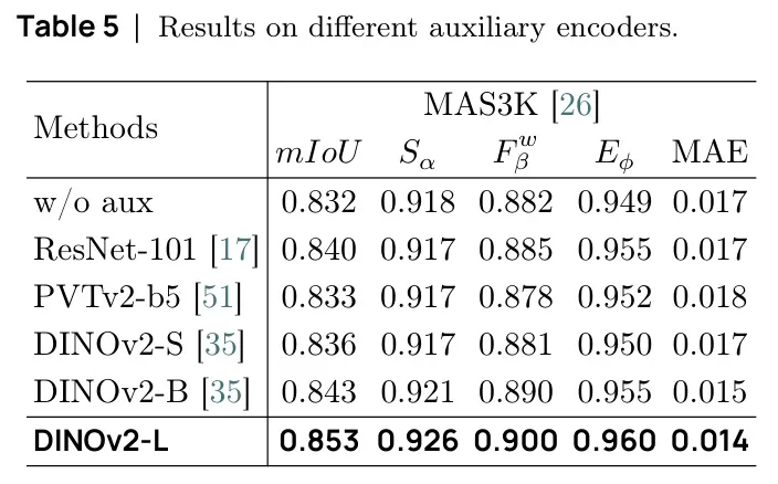 第2行和第3行。作者使用ResNet-101 PVTv2-b5 作为辅助编码器,其参数可训练。结果表明,与不使用辅助编码器的设置相比,改进效果微乎其微,这表明在简单的融合策略下,这些传统 Backbone 网络带来的好处有限。