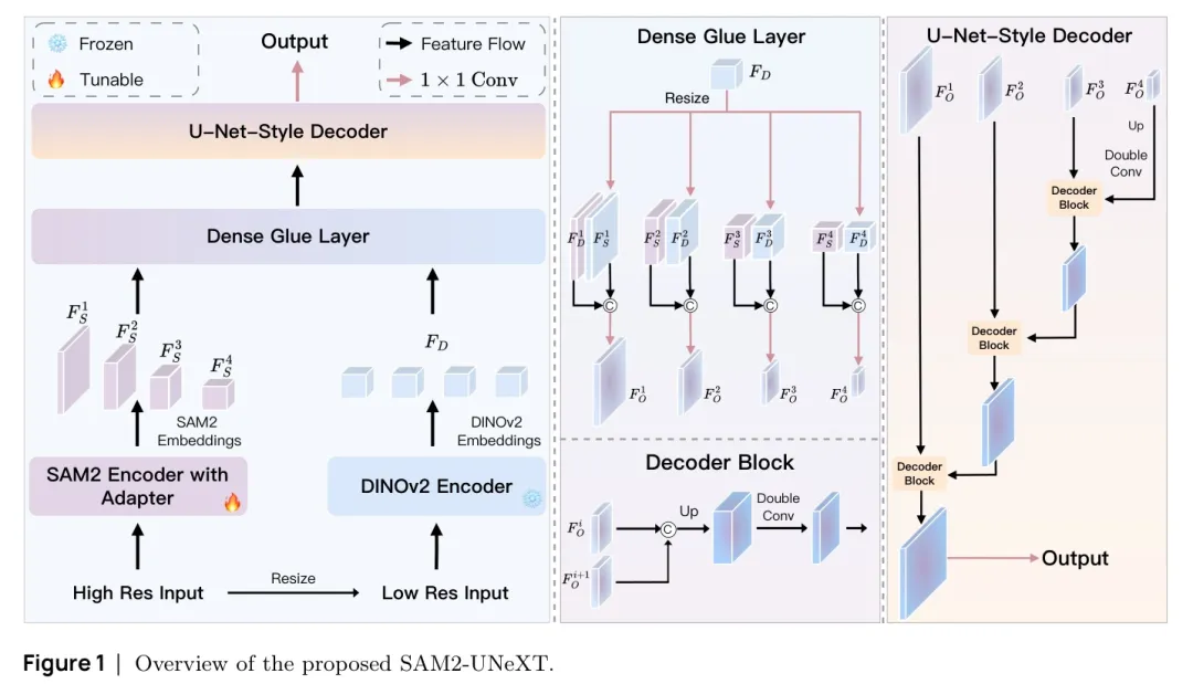 如图1所示,所提出的架构由四个关键组件构成:SAM2编码器、DINOv2编码器、密集粘合层和U-Net风格的解码器。