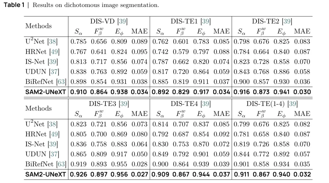 二值图像分割。结果如表1所示,SAM2-UNeXT在第二优方法BiRefNet之上实现了稳定的性能提升。具体而言,在DIS-VD子集上,SAM2-UNeXT将S-measure提升了1.2%。