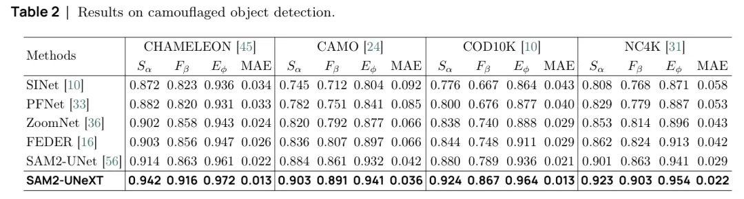 伪装目标检测。结果如表2所示。与SAM2-UNet相比,新的SAM2-UNeXT在所有指标上均实现了持续改进。例如,在CHAMELEON数据集上,SAM2-UNeXT将S-measure提升了2.8%。