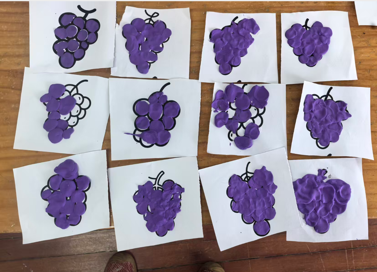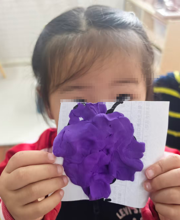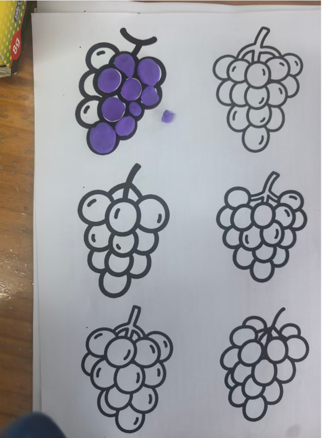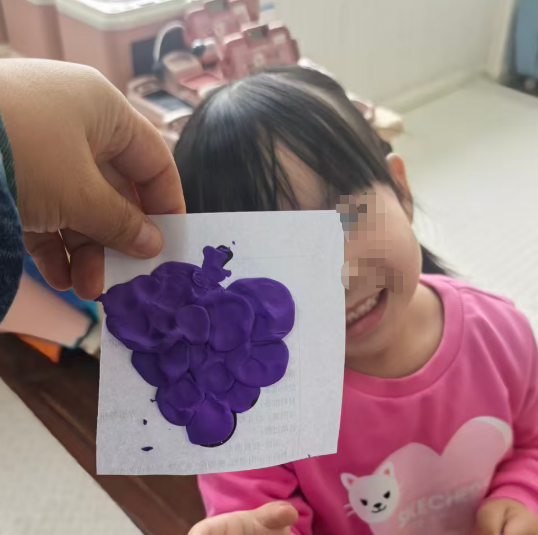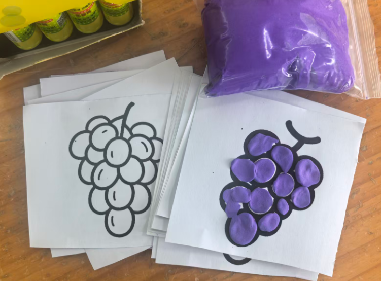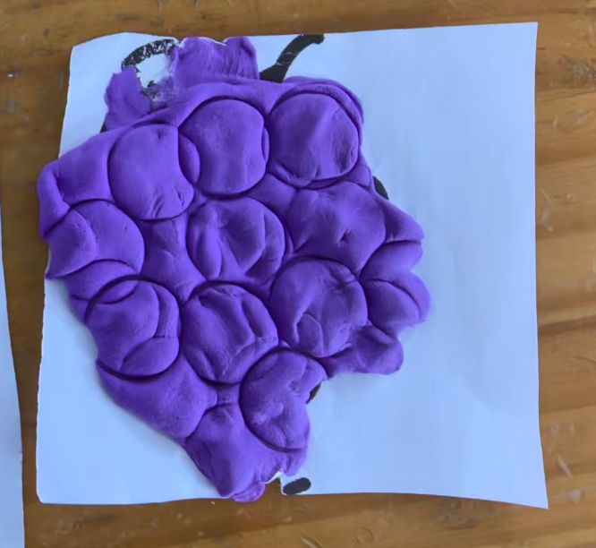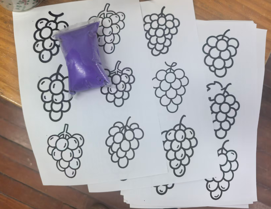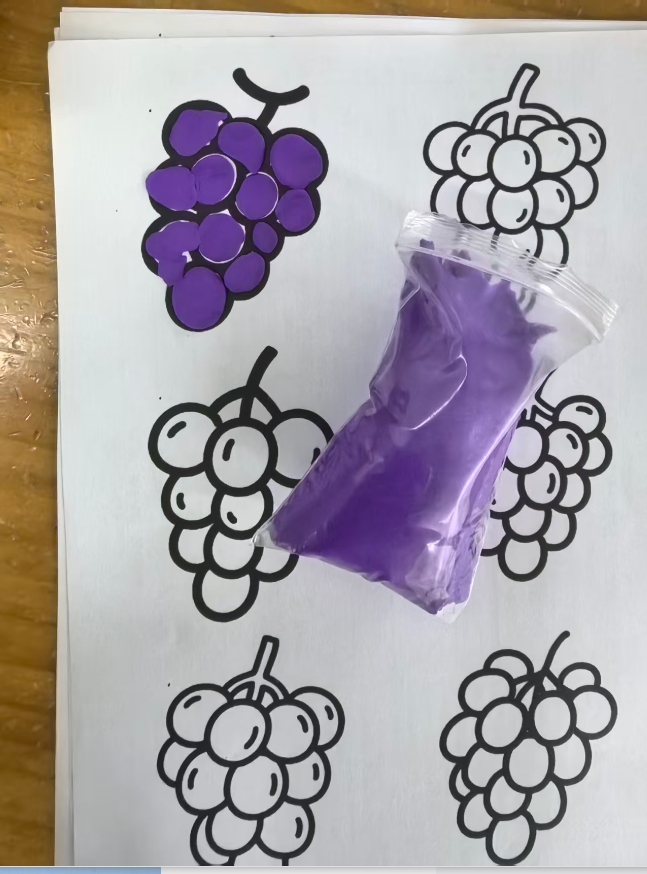 我准备用紫色的轻质彩泥或者圆形紫色纸片,让幼儿搓圆按压成圆形。