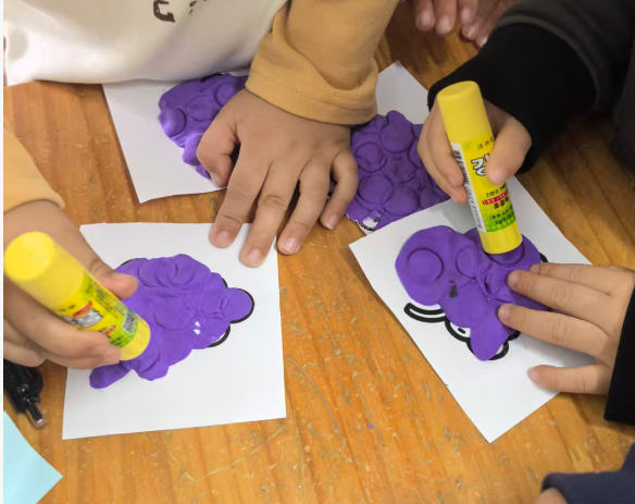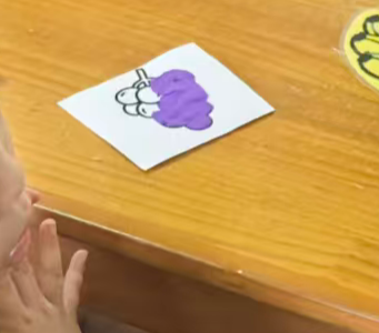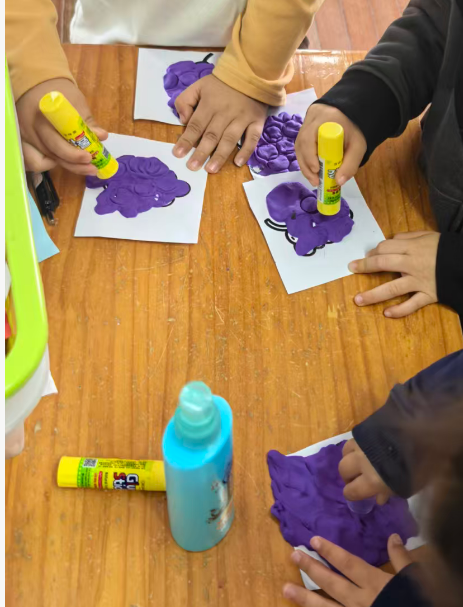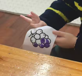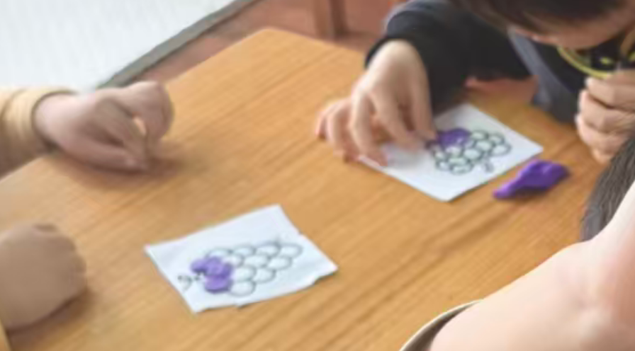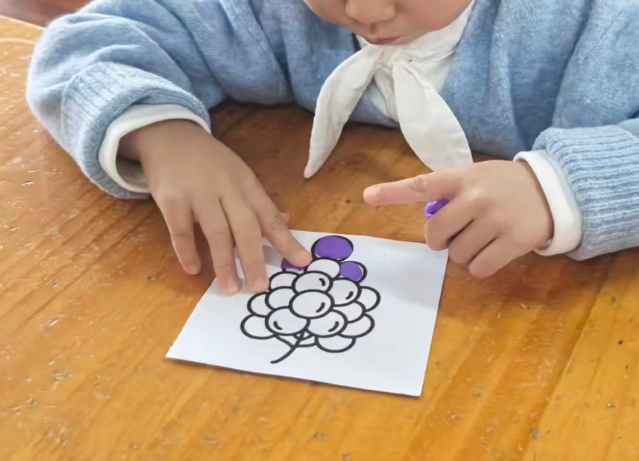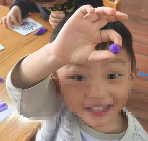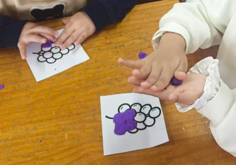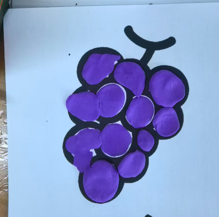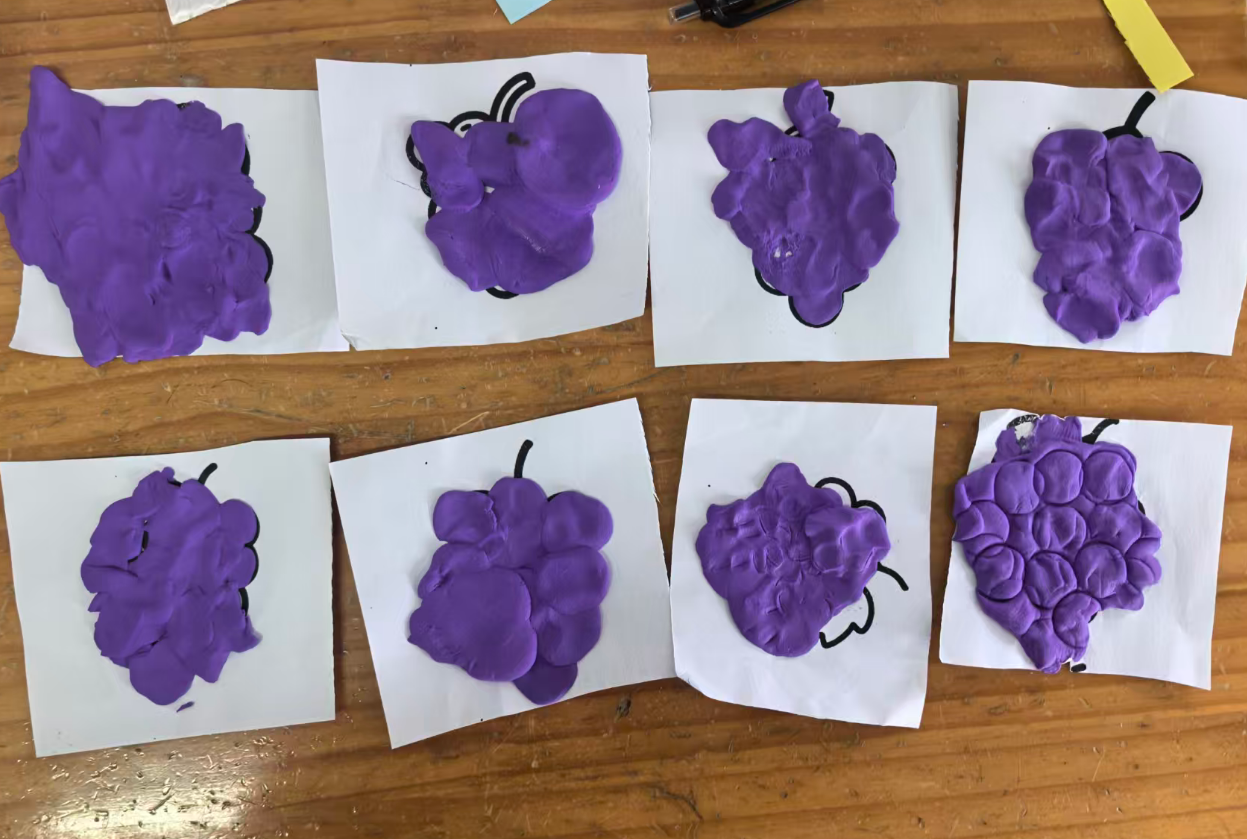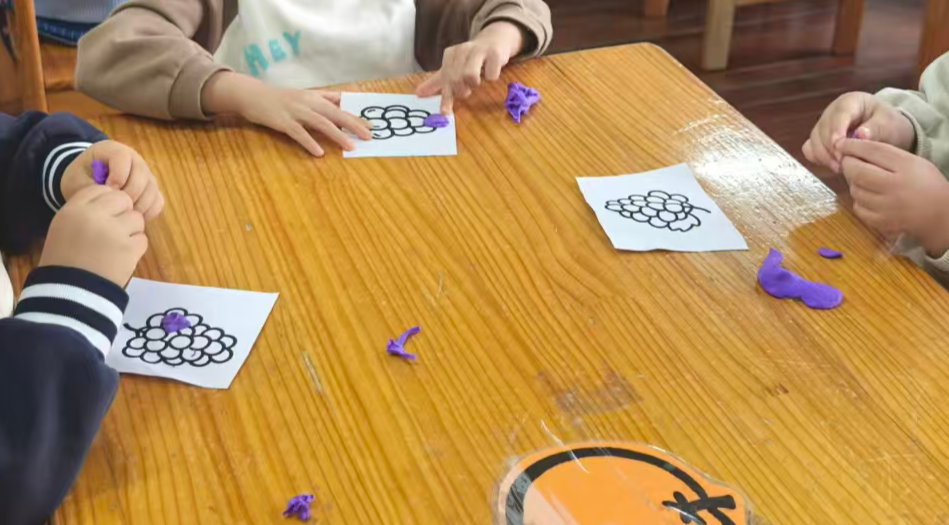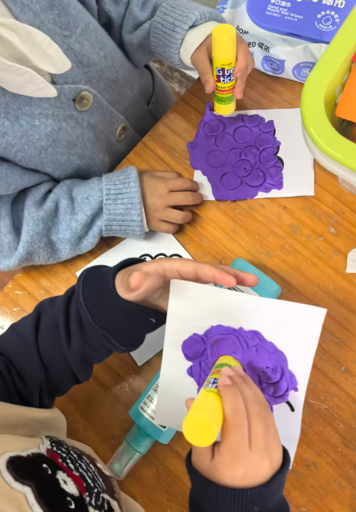 我准备用紫色的轻质彩泥或者圆形紫色纸片,让幼儿搓圆按压成圆形。
