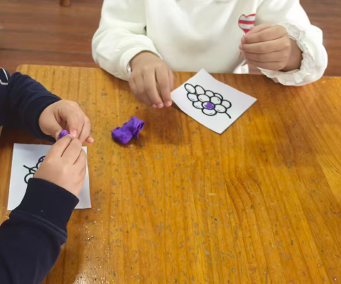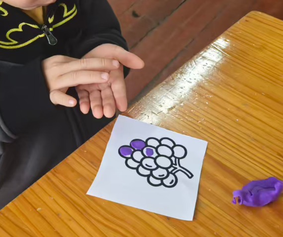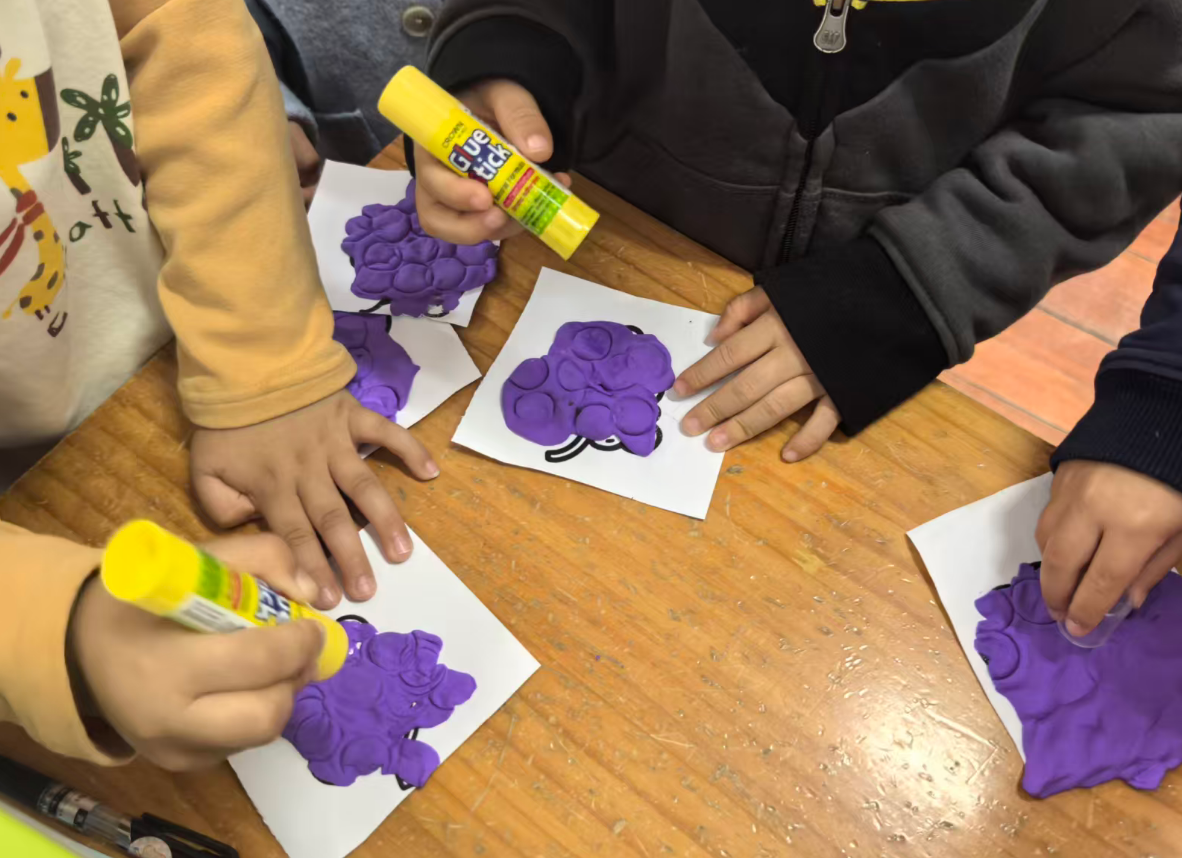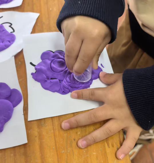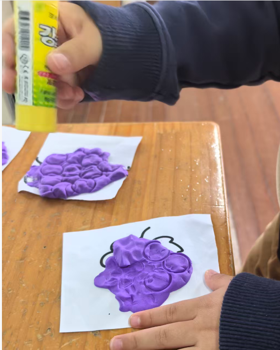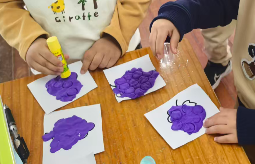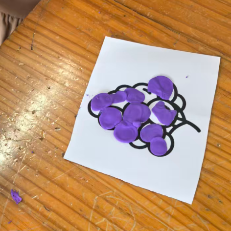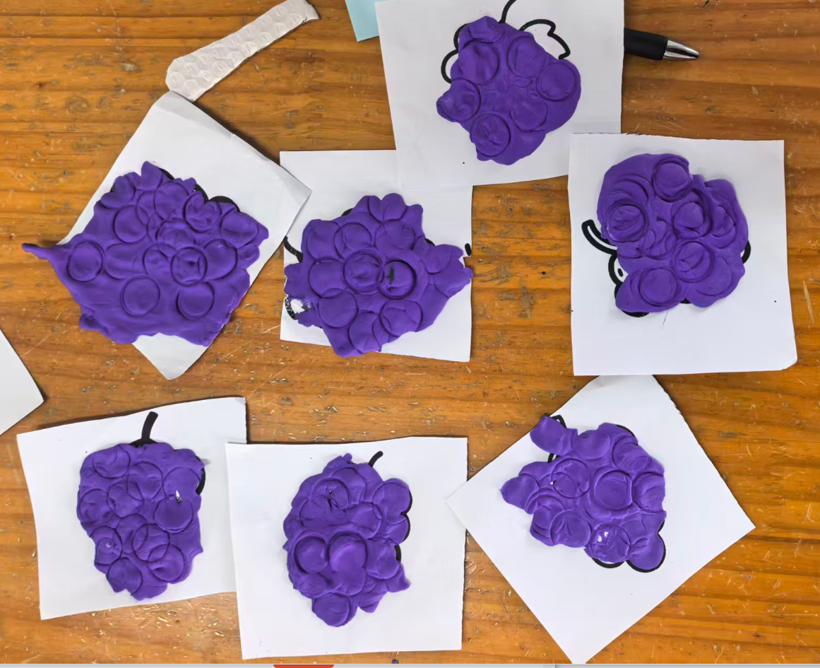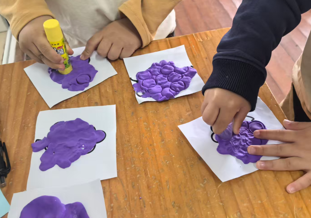 我准备用紫色的轻质彩泥或者圆形紫色纸片,让幼儿搓圆按压成圆形。
