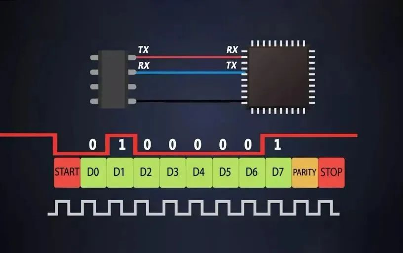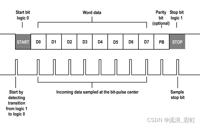 接收方通过检测"低电平起始位"触发接收,再按波特率同步采集后续 bits,最终重组为完整字节。