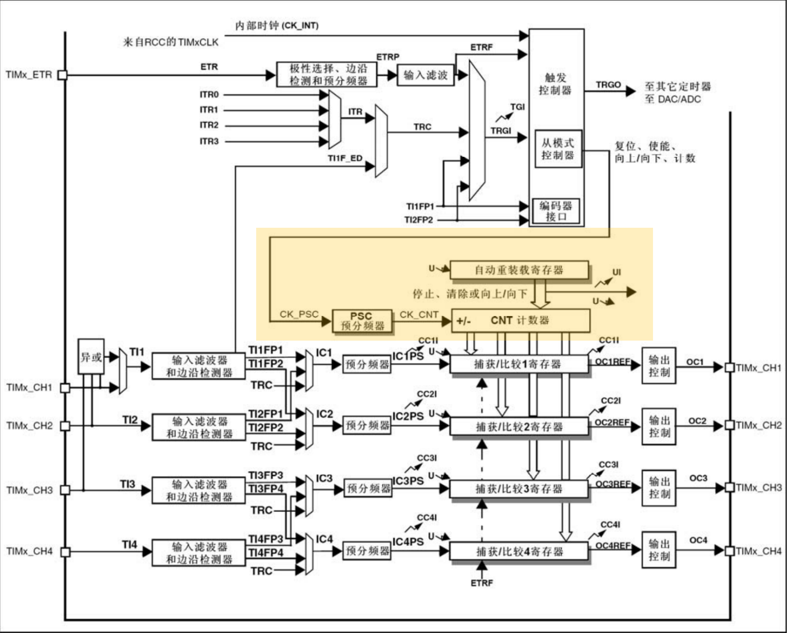 定时器框图中,使用黄色框圈住部分就是定时器的时基单元,包含3 个部分的内容:预分频寄存器(PSC)、计数器寄存器(CNT)、自动重装载寄存器(ARR)。