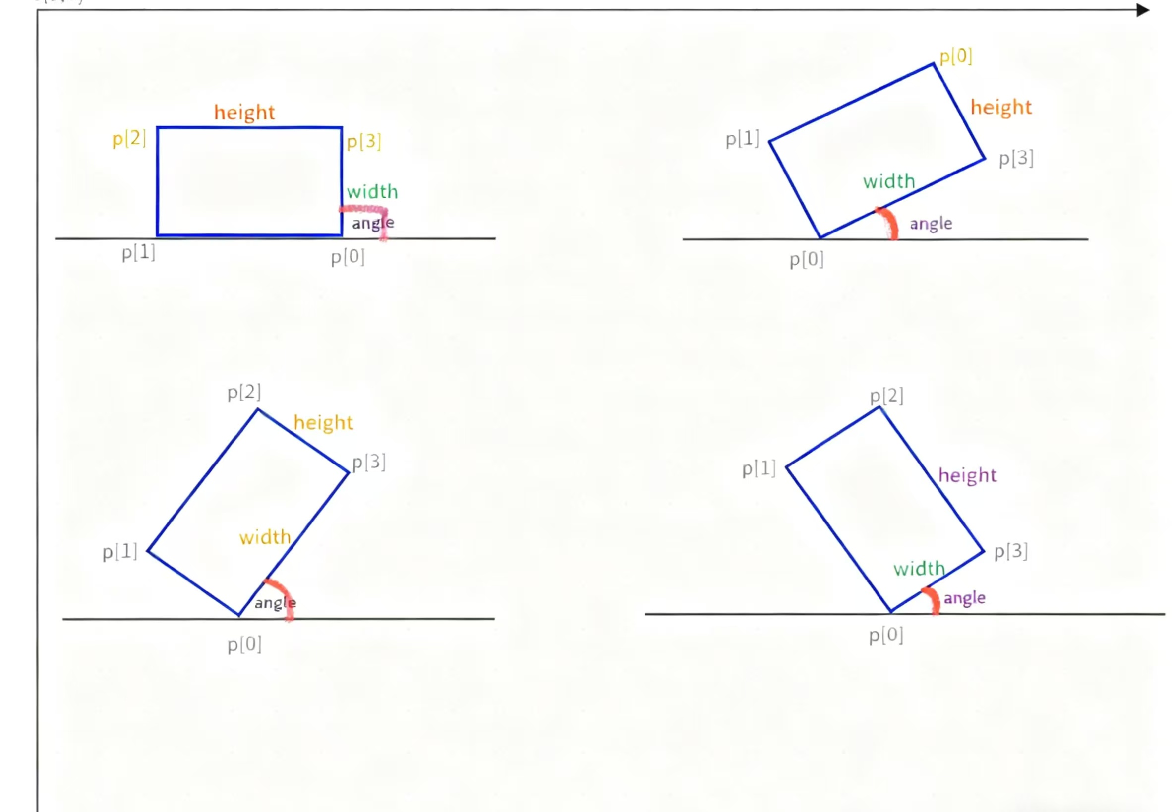- 当最小外接矩形不与坐标轴平行时,Y坐标最大的点即为p[0],如图2、3、4所示
