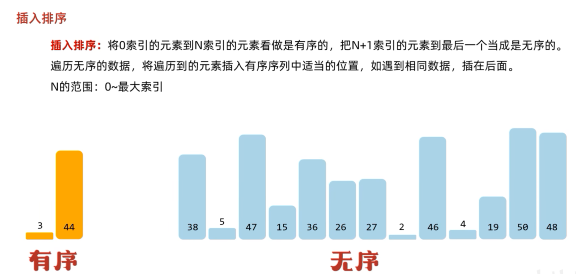 将0索引元素到N索引的元素看做是有序的,把N+1索引的元素到最后一个当成是无序的。