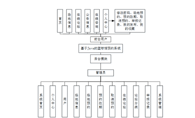 篮球馆预约系统分为二个模块,分别是管理员功能模块和用户功能模块。主要功能模块包括系统首页、个人中心、用户、场地信息、场地预约、预约改期、取消预约、在线论坛、论坛分类、举报记录、系统管理功能,网站总体功能如下图所示。