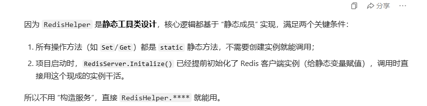 public abstract class RedisHelper : RedisHelper<RedisHelper>是一个非泛型子类,他继承自泛型父类RedisHelper<TMark>并给父类的 TMark 泛型参数传了 "自身类型 RedisHelper" 作为标记。非泛型子类的核心作用:"消除泛型参数", 原本使用父类要写 RedisHelper<SomeMark>.Set(...),现在通过非泛型子类 RedisHelper,可以直接写 RedisHelper.Set(...),简化调用语法。仔细去看父类的工具类,public static静态方法。静态方法的特性就是,无需实例化,子类自动继承。第二个原因就是,RedisHelper.Initialization ,已初始化Instance。这个instance工具类很多都能用到。