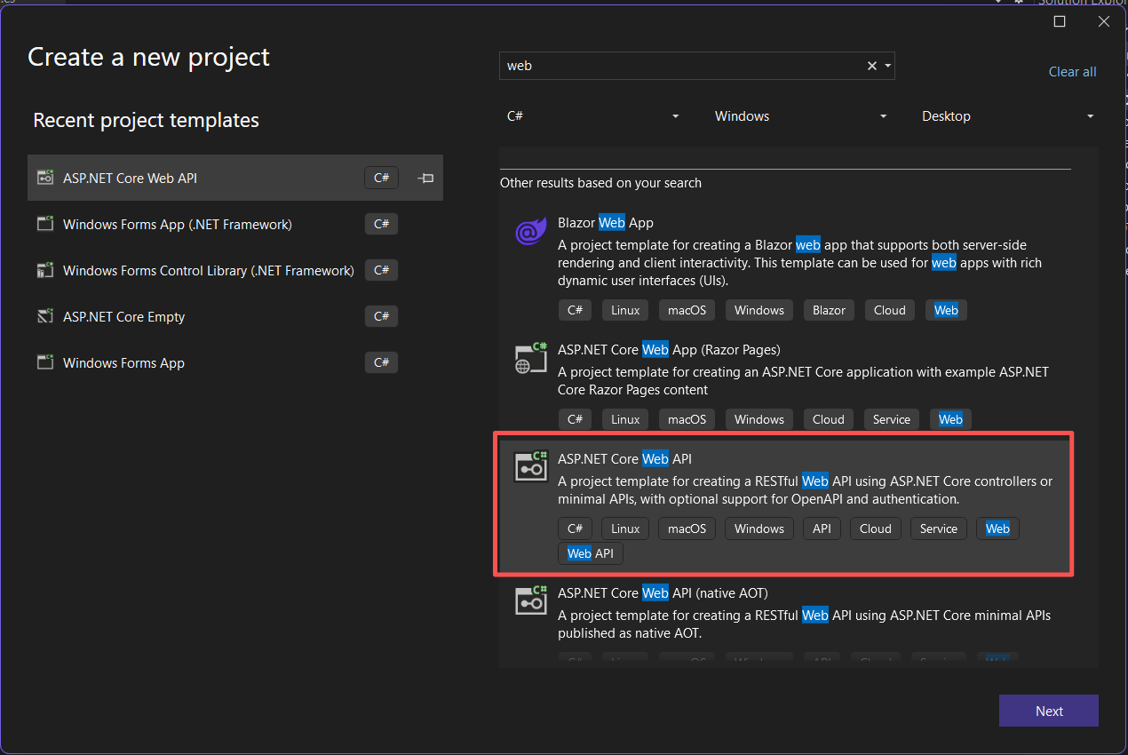 打开Visual Studio 2022,选择"创建新项目",模板选择"ASP.NET Core Web API",配置项目名称、保存路径及框架版本(建议选择.NET 9.0以匹配SDK版本)。创建后可默认生成WeatherForecast示例接口,用于后续测试。