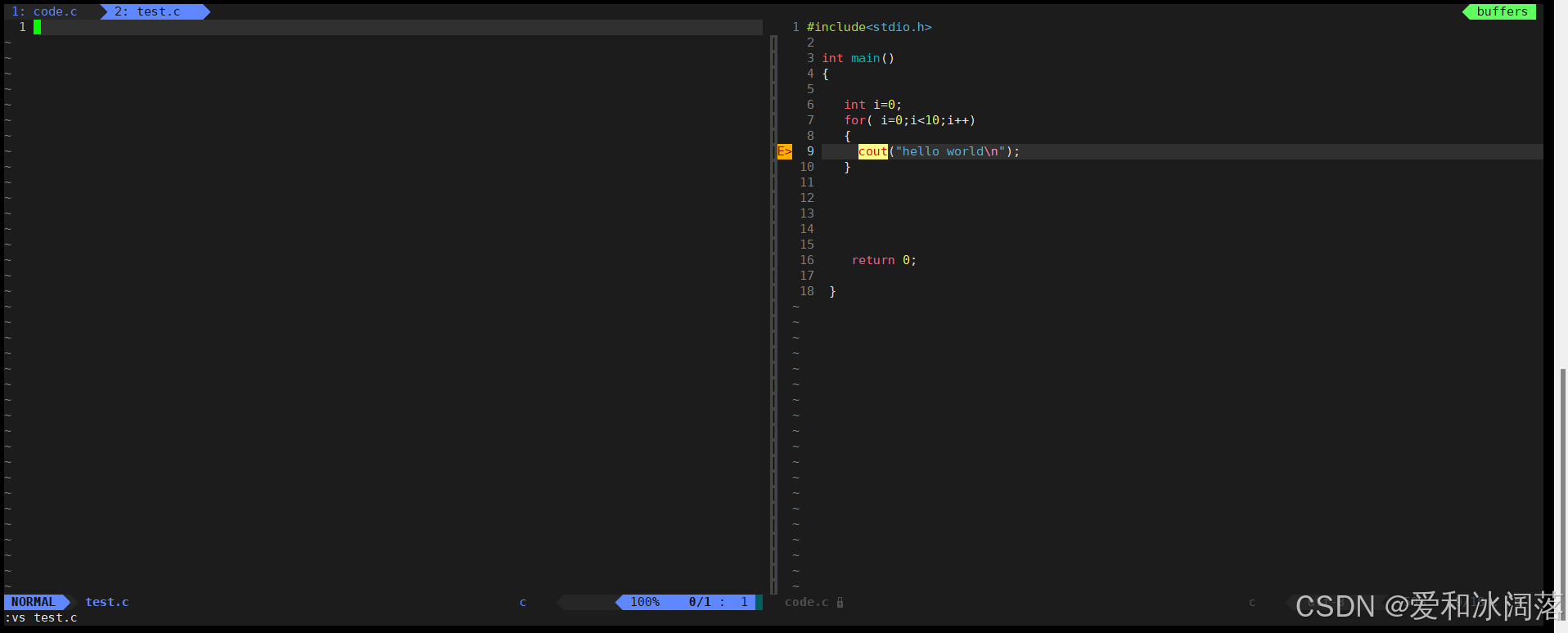 进入底行后,输入vs test.c,vim便会实现分屏操作,左边打开test.c ,右边是code.c