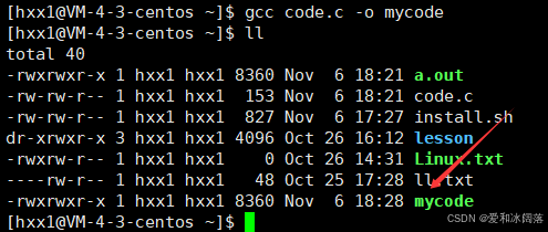如若我们想要将编译后的文件形成特定的可执行程序只需 :gcc code.c -o mycode(-o是形成目标文件的意思),那么就形成了mycode的可执行程序了