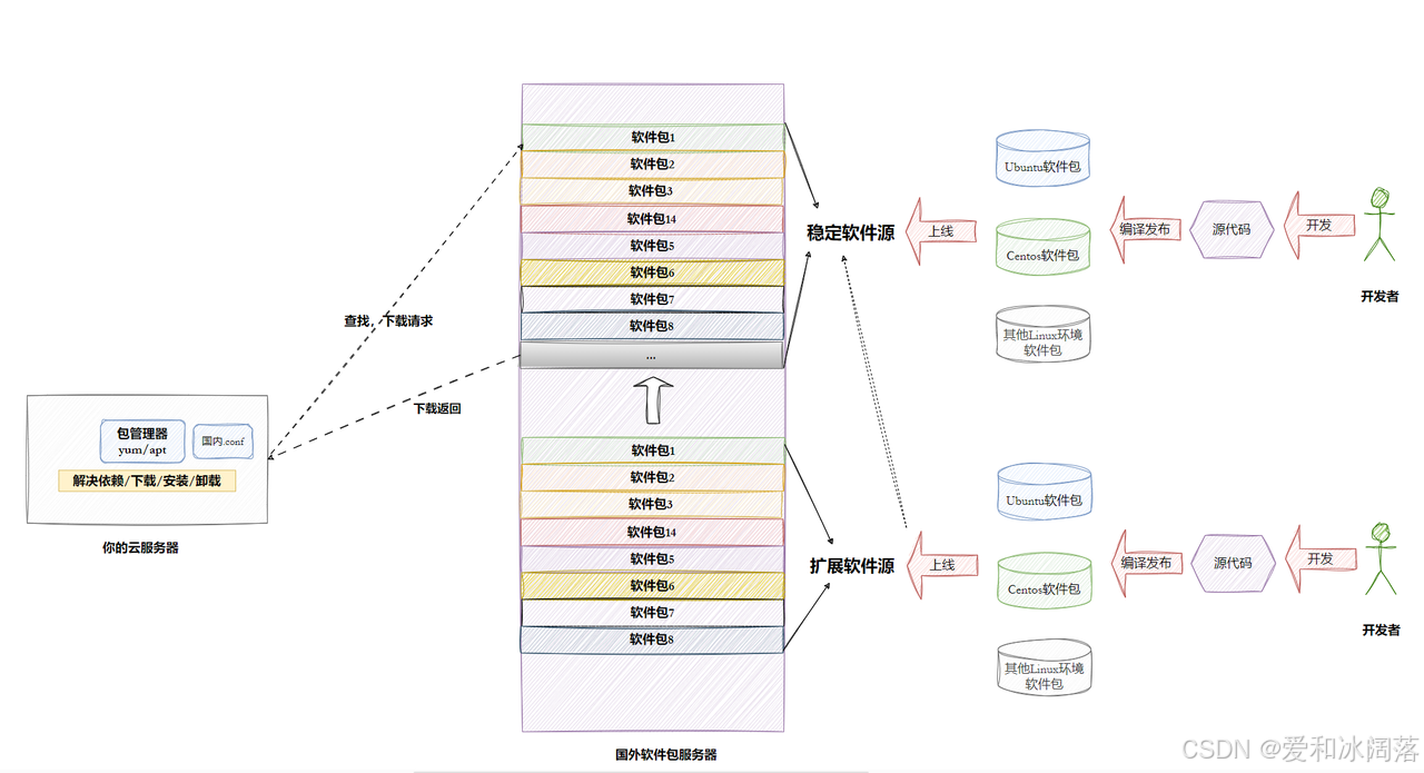 了解完生态的概念,我们便可以知道Linux下载软件的过程,开发者开发对应的软件,将其的源代码托管到其的官网上/github上,再将源代码编译形成了可以直接被安装的软件,再将软件上到对应的社区中。因此用户只需在自己的Linux中通过yum/apt在社区中进行下载