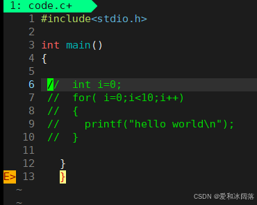 对代码进行批量化注释,我们虽然可以直接从命令模式切换到插入模式,若如进行多行注释,不断来回切换太过于繁琐,因此这里我们便需要介绍一种新的模式------视图模式,我们在命令模式下按 ctrl+v,在vim左下角出现V-BLOCK即可,在该模式下,我们可以按"hjkl"进行区域的选择,