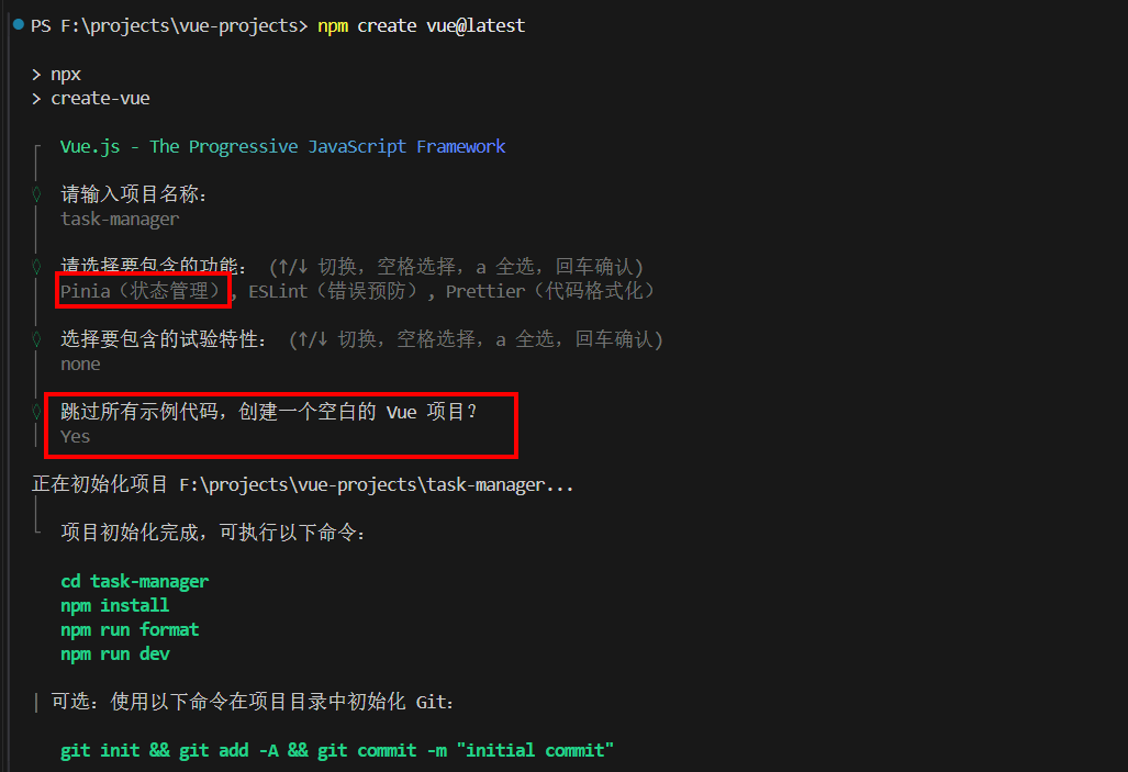 (1)使用 npm create vue@latest 创建项目。项目名为 task-manager ,勾选配置项 Pinia(状态管理)。因为这是个示例项目,只有一个页面,所以就不勾选 Router 选项了。