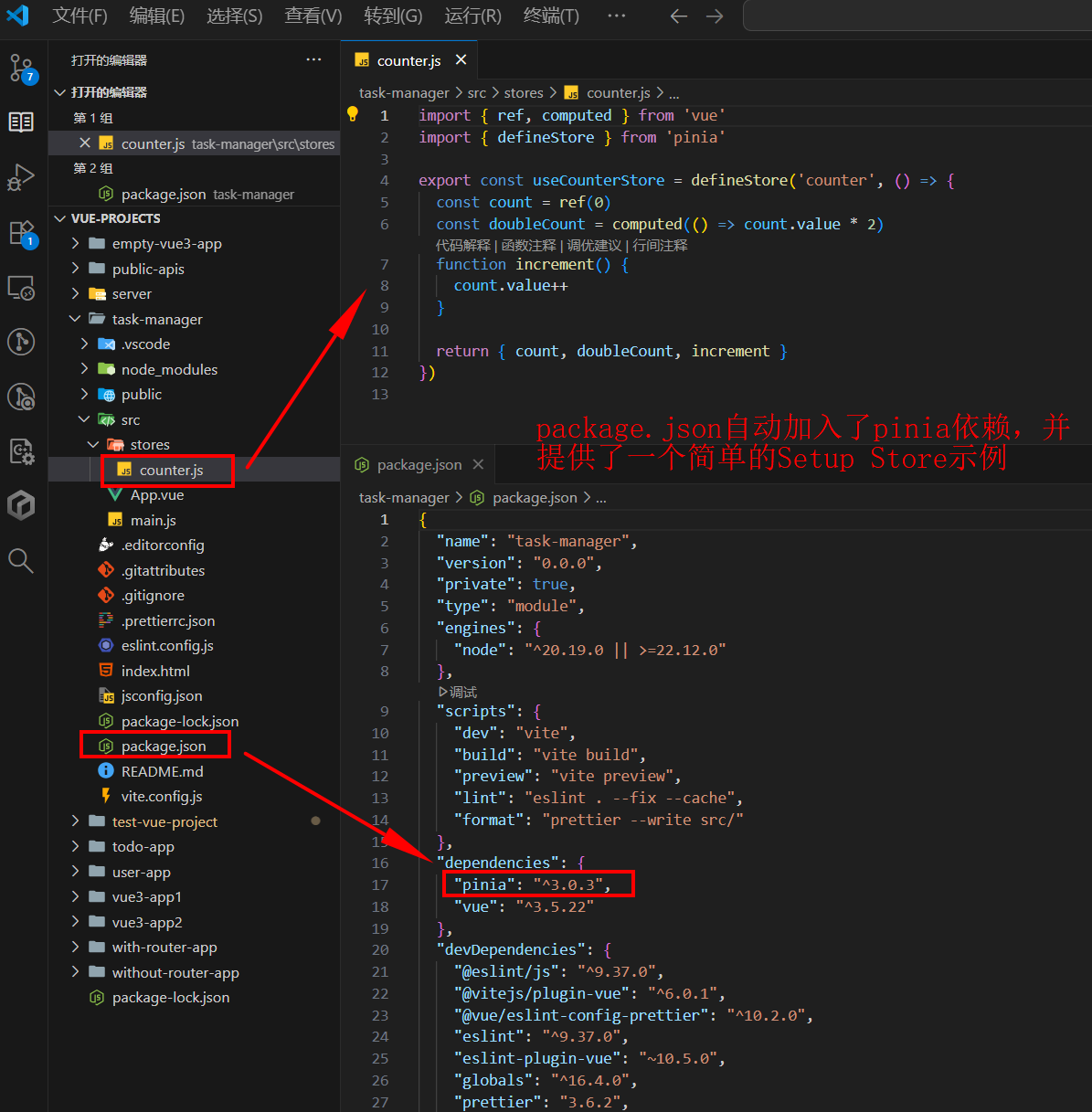 和未勾选 pinia 配置项的项目相比,package.json 自动下载了依赖,并且创建了 stores/counter.js,作为一个简单的定义 Setup Store 示范。