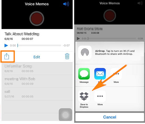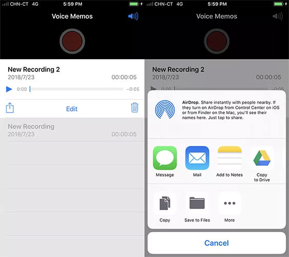 - 回到 iPhone,打开"语音备忘录",选择要传输的录音,点击"分享";