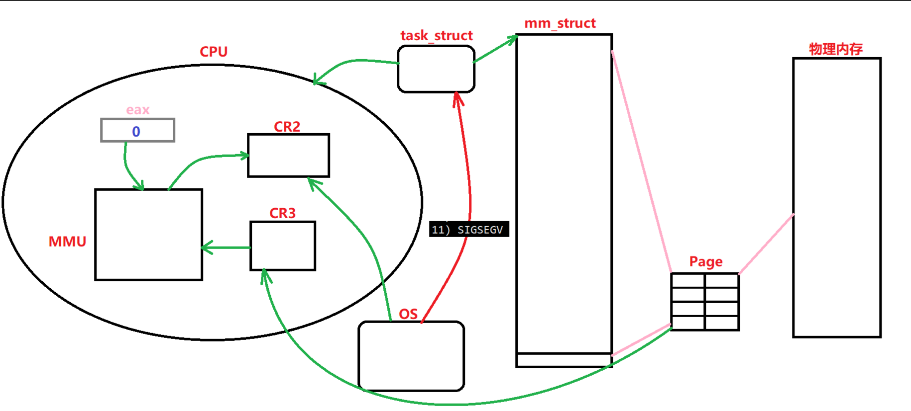 当进程出现了野指针异常时,当前进程就会停止调度,OS就会来检查为何当前进程停止调度,而CPU对cr2寄存器进行读取,发现当前进程出现了野指针错误,于是OS就对当前进程发送11号信号(SIGSEGV)从而终止进程!