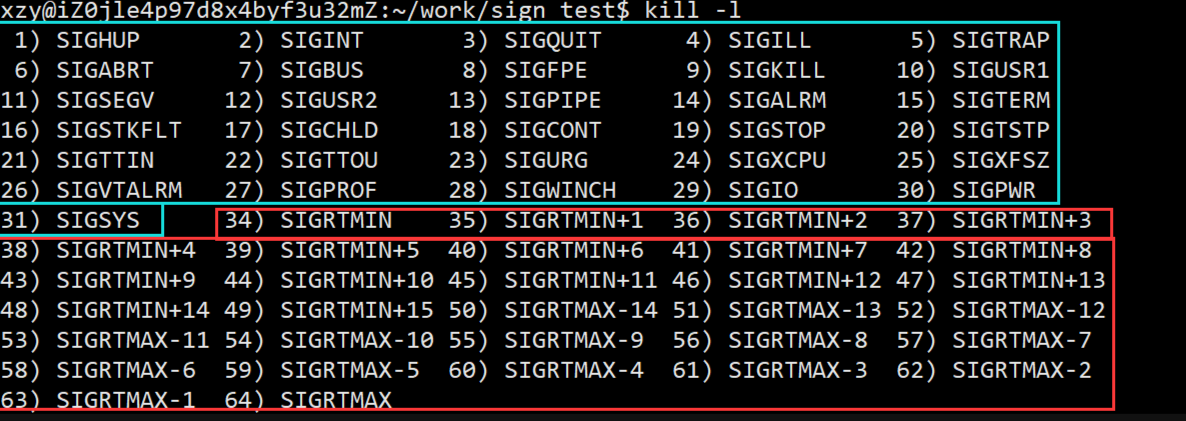 Linux中,有 62种信号 ,前31种(1~31)信号被称为 标准信号 ,每个信号都有特殊的含义及用途。后31种(34~64)信号被称为 实时信号 ,可用于实时应用程序的拓展信号,提供了更多的灵活性。注意中间并没有32和33号信号 。