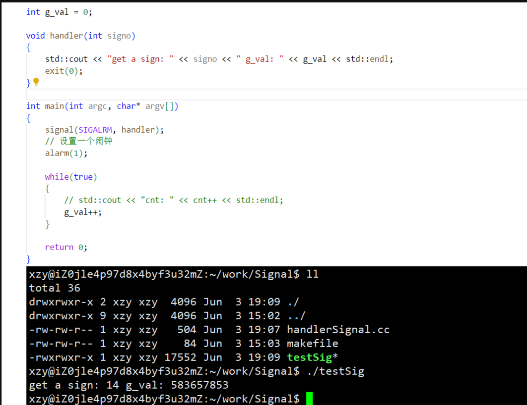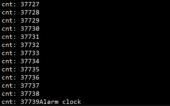 cpp#include <iostream> #include <unistd.h> #include <signal.h> #include <cerrno> #include <string> #include <cstring> #include <sys/types.h> int main(int argc, char* argv[]) { // 设置一个闹钟 alarm(1); int cnt = 0; while(true) { std::cout << "cnt: " << cnt++ << std::endl; } return 0; }大概有3万七千次左右,虽然我们云服务器配置不高,但是3万7千次未免太少了。我们把打印信息注释掉,并且设置一个全局变量,让其在循环内一直做++,对14号信号再进行捕捉,捕捉回调方法打印全局变量: