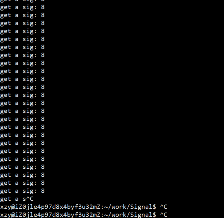 但是当前进程被我们设置为一直在运行,异常在进程中仍然存在,这个时候OS又会向OF读取异常数据,进而再一次的对当前进程发送8号信号,这样不断的循环,就导致了上图的结果。