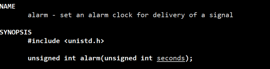 cpp#include <unistd.h> unsigned int alarm(unsigned int seconds);